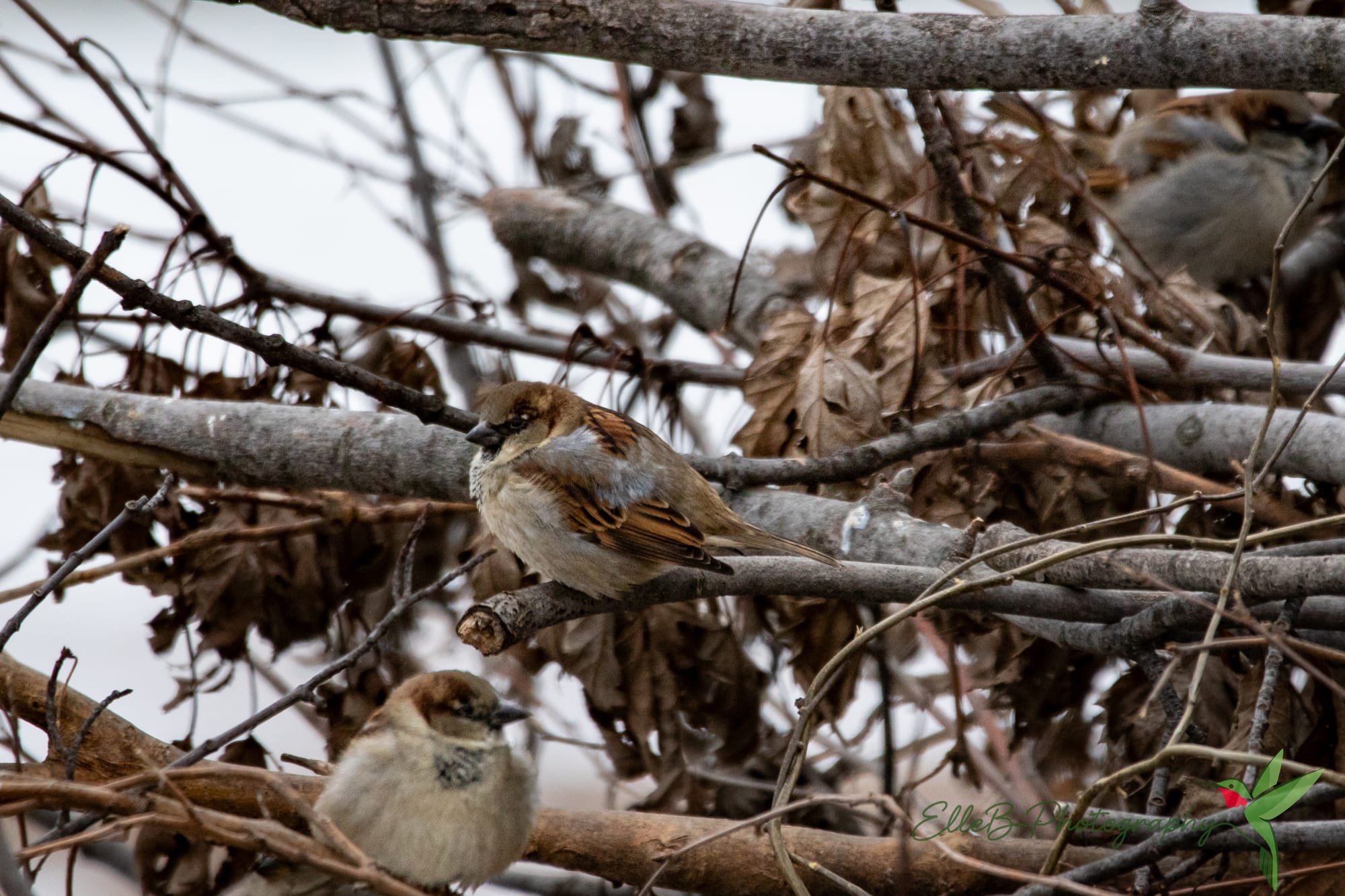 House Sparrow, Downy Woodpecker